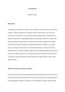 The teaching of sex education in schools raises a number of contentious issues. For one thing, whether sex education should even be taught in schools is questioned by some. Then, the precise aims of sex education vary greatly. Other issues include the age at which school sex education should start, the teaching approaches to be used, the framework(s) of values within which it should take place, whether or not parents have the right to withdraw their children from school sex education, whether classes should (sometimes) be single sex, who should teach it, the training which teachers of sex education should receive and where within the school curriculum it should be taught. In addition, there are conceptual difficulties in deciding how best to evaluate sex education. This chapter cannot deal with all these issues but focuses on questions of especial importance for those training to be school teachers or early in their teaching careers.