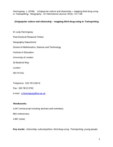 Title: | (Un)popular Culture and Citizenship — mapping illicit drugusing in Trainspotting |
