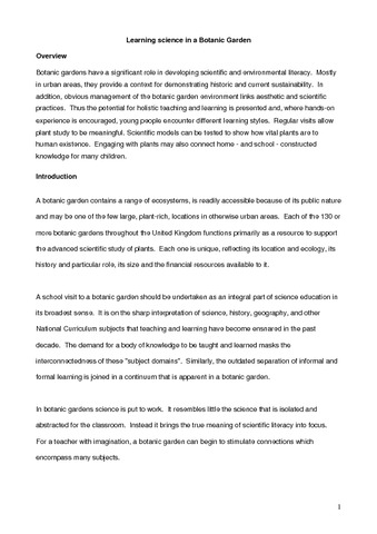 Botanic gardens have a significant role in developing scientific and environmental literacy. Mostly in urban areas, they provide a context for demonstrating historic and current sustainability. In addition, management of the botanic garden environment links aesthetic and scientific practices. Thus the potential for holistic teaching and learning is presented and, where hands-on experience is encouraged, young people encounter different learning styles. Regular visits allow plant study to be meaningful. Scientific models can be tested to show how vital plants are to human existence. Engaging with plants may also connect home-and school-constructed knowledge for many children.