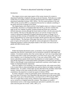 ducational leadership in England, drawing on relevant literature. Particular use is made of data from two rounds of survey research which focussed on the impact of gender on educational leadership (Coleman, 2002, 2005a). The first round took place in the mid 1990s and the second in 2004 so a comparison between the two indicates something of the nature and extent of change in this period. The chapter begins with a brief overview of the English context as it relates to women in leadership. The choice is of England rather than the UK, as the four countries that make up the UK: England; Scotland; Northern Ireland and Wales have somewhat different education systems although the broad trends are likely to be the same across the four countries. The focus of the paper then turns to an overview of major issues for women in educational leadership in England indicating the nature of change; first in accessing and then carrying out leadership roles; and secondly exploring the impact of family responsibilities for women and men leaders and the questions that arise relating to work/life balance. The final part of this paper then turns to how we might work towards goals of equity and social justice, through the content and approach of educational leadership programs to inform and prepare leaders of the future to be more aware of gender and other diversity issues.