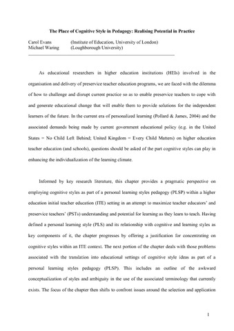 The Place of Cognitive Style in Pedagogy: Realising Potential in Practice.