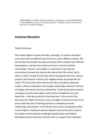 This chapter begins to explore the idea, and origins, of inclusive education and some of the very different ways the term is used in different contexts. We will consider the possible meanings and values which underpin these different interpretations, and how these relate to the lives of schools and their communities. The term ‘communities’ is used here to mean both the communities of people who make up the internal life of the school, and to refer to a wider concept of community which encompasses the lives, cultures, practices and interests of those in the neighbourhoods associated with the school. This discussion will be linked to the often contradictory demands made on all those implicated in the complex relationships involved in the lives of colleges and schools, learning and teaching. Teaching assistants, teachers and pupils are at the sharp edge of where these contradictions are most keenly felt – in the day-to-day life of the classroom. In the course of the discussion the chapter will draw on some examples of research to raise some issues about the role of teaching assistants in developing inclusive relationships and practices. It will end with some issues and questions which may be helpful in making connections between some of the points raised in the chapter and the particular challenges faced by those committed to developing inclusive education and who work in a support role in education.