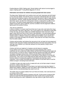 The ideas about ‘fighting spirit’ and ‘positive mind over body’ responses are both based on the same two beliefs. First that the person concerned understands about the cancer, the risks and the treatment options. And second that the person is able to make choices and decisions. However, people still often hold back, not only from informing children about their cancer, but also from offering them choices or seeing them as able to have any control. This article reviews arguments for and against informing and involving children during their cancer treatment, and then considers how the arguments relate to fighting spirit and positive thinking.