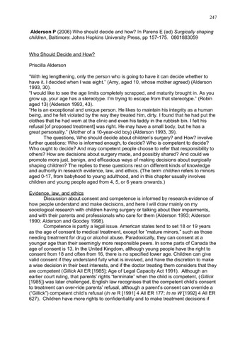 “With leg lengthening, only the person who is going to have it can decide whether to have it. I decided when I was eight.” (Amy, aged 10, whose mother agreed) (Alderson 1993, 30). “I would like to see the age limits completely scrapped, and maturity brought in. As you grow up, your age has a stereotype. I’m trying to escape from that stereotype.” (Robin aged 13) (Alderson 1993, 43). “He is an exceptional and unique person. He likes to maintain his integrity as a human being, and he felt violated by the way they treated him, dirty. I found that he had put the clothes that he had worn at the clinic and even his teddy in the rubbish bin. I felt his refusal [of proposed treatment] was right. He may have a small body, but he has a great personality.” (Mother of a 10-year-old boy) (Alderson 1993, 39). The questions, Who should decide about children’s surgery? and How? involve further questions: Who is informed enough, to decide? Who is competent to decide? Who ought to decide? And may competent people choose to refer that responsibility to others? How are decisions about surgery made, and possibly shared? And could we promote more just, benign, and efficacious ways of making decisions about surgically shaping children? The replies to these questions rest on different kinds of knowledge and authority in research evidence, law, and ethics. (The term children refers to minors aged 0-17, from babyhood to young adulthood, and in this chapter usually involves children and young people aged from 4, 5, or 6 years onwards.)
