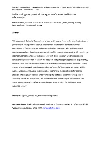 Title: | Bodies and agentic practice in young women’s sexual and intimate relationships |