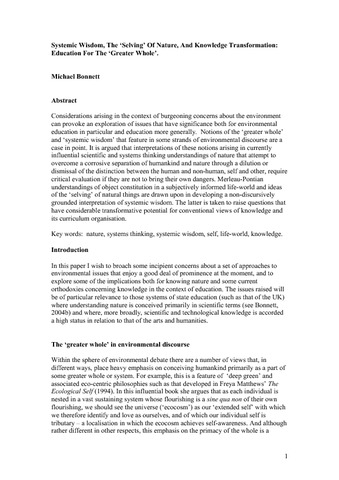 | Title: | Systemic wisdom, the 'selving' of nature, and knowledge transformation: education for the 'greater whole' |
