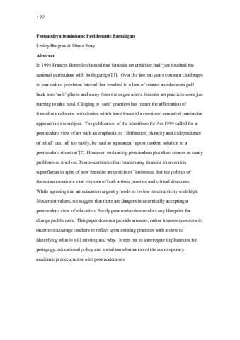 In 1995 Frances Borzello claimed that feminist art criticism had „just touched the national curriculum with its fingertips‟[1]. Over the last ten years constant challenges to curriculum provision have all but resulted in a loss of contact as educators pull back into „safe‟ places and away from the edges where feminist art practices were just starting to take hold. Clinging to „safe‟ practices has meant the affirmation of formalist modernist orthodoxies which have fostered a restricted canonical patriarchal approach to the subject. The publication of the Manifesto for Art 1999 called for a postmodern view of art with an emphasis on „difference, plurality and independence of mind‟ can, all too easily, be read as a panacea „a post modern solution to a postmodern situation‟[2]. However, embracing postmodern pluralism creates as many problems as it solves. Postmodernism often renders any feminist intervention superfluous in spite of new feminist art criticisms‟ insistence that the politics of feminism remains a vital element of both artistic practice and critical discourse. While agreeing that art education urgently needs to review its complicity with high Modernist values, we suggest that there are dangers in uncritically accepting a postmodern view of education. Surely postmodernism renders any blueprint for change problematic. This paper does not provide answers, rather it raises questions in order to encourage teachers to reflect upon existing practices with a view to identifying what is still missing and why. It sets out to interrogate implications for pedagogy, educational policy and social transformation of the contemporary academic preoccupation with postmodernism.