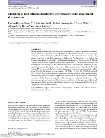 Modelling of mid-infrared interferometric signature of hot exozodiacal dust emission.
