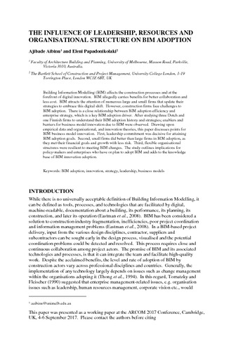 2017_ARCOM_The influence of leadership, resources and organisational structure on BIM adoption_Aibinu.pdf - Published Version Download (133kB) | Preview |