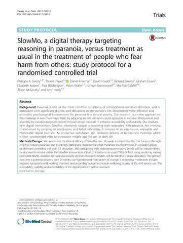 | Title: | SlowMo, a digital therapy targetingreasoning in paranoia, versus treatment asusual in the treatment of people who fearharm from others: study protocol for arandomised controlled trial |