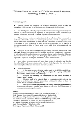 Title: | UCL Department of Science and Technology Studies submission of evidence to the House of Commons Science and Technology Select Committee inquiry into science communication |