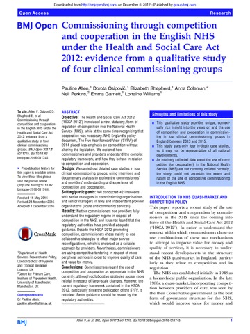 Commissioning through competition and cooperation in the English NHS under the Health and Social Care Act 2012: Evidence from a qualitative study of four clinical commissioning groups.