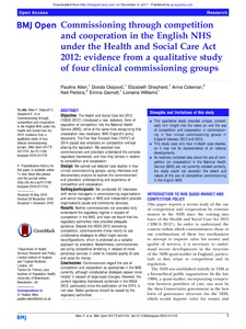 Title: | Commissioning through competition and cooperation in the English NHS under the Health and Social Care Act 2012: Evidence from a qualitative study of four clinical commissioning groups |