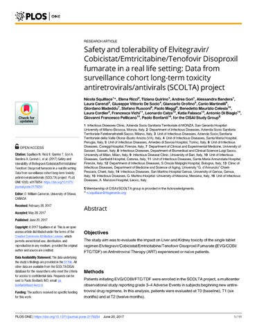 | Title: | Safety and tolerability of Elvitegravir/Cobicistat/Emtricitabine/Tenofovir Disoproxil fumarate in a real life setting: Data from surveillance cohort long-term toxicity antiretrovirals/antivirals (SCOLTA) project |
