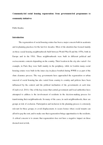 Engaging communities in neighbourhood regeneration processes is vital for achieving inclusive cities, particularly when vulnerable groups belong to these communities. In the UK, different governments have implemented diverse strategies, funding schemes and approaches to social housing estates’ regeneration, which have implied various degrees of involvement of the residents in decision-making processes. This paper explores the approaches to community participation in the regeneration of social housing neighbourhoods since 1997—when the New Labour won the general elections—until today. Within this period, it identifies two models: the government-led regeneration scheme New Deal for Communities implemented by the New Labour Government, which provided funding for intervening in deprived areas and which included representatives of the community in the decision-making board; and the Big Society approach implemented by the Coalition Government in the context of austerity, which advocates for a state-enabling approach and has changed the planning system to involve communities in decision-making. The paper explores how these two models have addressed the participation of residents in social housing regeneration. For doing so, it looks at the policy context and case studies in these two periods. The paper concludes that community participation needs easier processes, which do not require such a strong effort from community groups. It also concludes that both funding and support is needed to promote community engagement in regeneration processes, which can, firstly, serve as an incentive to be more actively involved in the regeneration of their neighbourhood, and secondly, do not rely on private investment for the improvement of council estates.