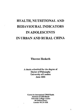 | Title: | Health, nutritional and behavioural indicators in adolescents in urban and rural China |