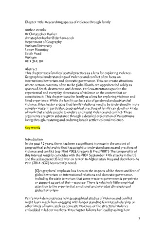 This chapter uses families’ spatial practices as a lens for exploring violence. Geographical understandings of violence and conflict often focus on international terrorism and domestic governance. This can create situations where certain contexts, often in the global South, are apprehended solely as spaces of death, destruction, and demise. Far less attention is paid to the experiential and everyday dimensions of violence or the context that coconstitutes it. This chapter uses the family as a lens for exploring violence and lived experience. While the family can be a site of gendered, generational, and patriarchal violence, this chapter argues that family relations need to be understood in more complex ways. In particular, geographical practices of family can do other kinds of work that enable people to endure and resist violence and conflict. These arguments are given substance through a detailed exploration of Palestinians living through, resisting, and enduring Israeli settler-colonial violence.
