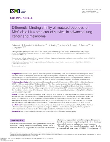 Differential binding affinity of mutated peptides for MHC class I is a predictor of survival in advanced lung cancer and melanoma.