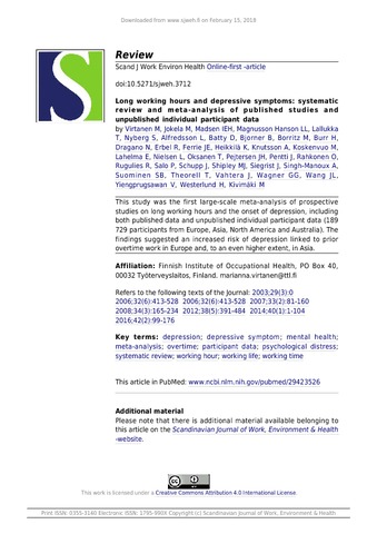 Title: | Long working hours and depressive symptoms: systematic review and meta-analysis of published studies and unpublished individual participant data |