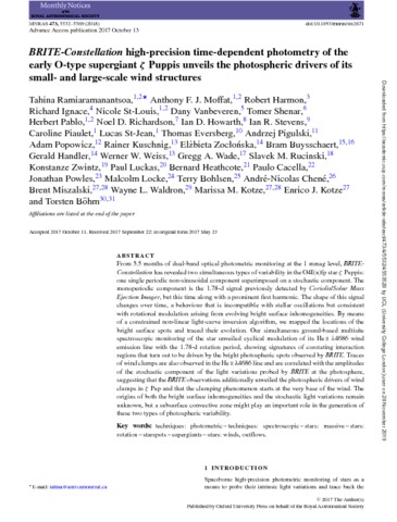 Title: | BRITE-Constellation high-precision time-dependent photometry of the early O-type supergiant zeta Puppis unveils the photospheric drivers of its small- and large-scale wind structures |