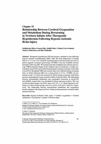 | Title: | Relationship Between Cerebral Oxygenation and Metabolism During Rewarming in Newborn Infants After Therapeutic Hypothermia Following Hypoxic-Ischemic Brain Injury |