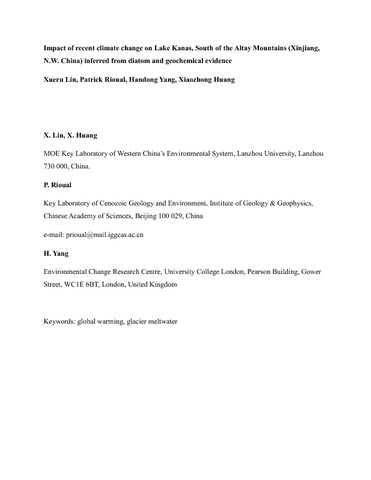 Title: | Impact of recent climate change on Lake Kanas, Altai Mountains (N.W. China) inferred from diatom and geochemical evidence |