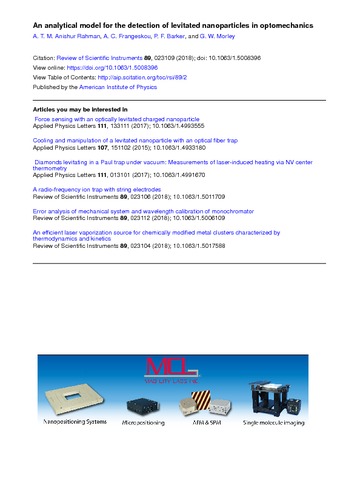 An analytical model for the detection of levitated nanoparticles in optomechanics.