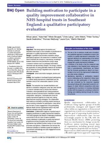 Title: | Building motivation to participate in a quality improvement collaborative in NHS hospital trusts in Southeast England: a qualitative participatory evaluation. |