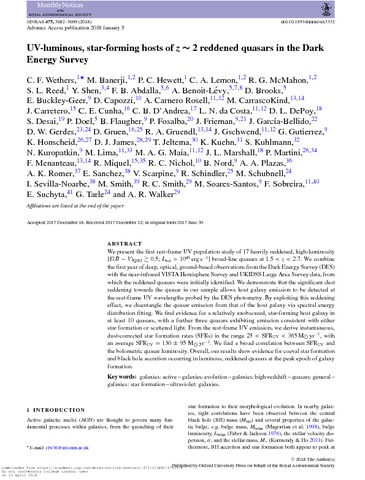 Title: | UV-luminous, star-forming hosts of z similar to 2 reddened quasars in the Dark Energy Survey |