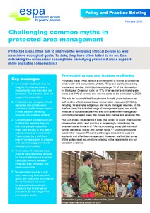 Protected areas remain a cornerstone of efforts to conserve biodiversity and ecosystems globally. They are rapidly increasing in size and number. Aichi biodiversity target 11 of the Convention on Biological Diversity calls for 17% of terrestrial and inland water areas and 10% of coastal and marine areas to be protected by 2020. Key messages of this policy brief are: It is a widely held myth that the integrity of protected areas is threatened by poor people in the local area. The evidence does not support this assumption. Protected area managers should recognise that conservation activities can affect many aspects of local people’s wellbeing, including non-material aspects. Compensation is rarely sufficient to offset the negative impacts that local people may suffer when their access to and use of natural resources is restricted. There should be a shift from one-off compensation to ongoing and adaptive engagement with affected communities. Governance of protected areas must be more equitable, allowing for full and effective participation by and partnership between protected area managers and local communities. Tenure rights can play a vital role in securing local people’s rights and incentives to conserve the environment but must be approached sensitively, to ensure that formal tenure processes do not marginalise poor people further.