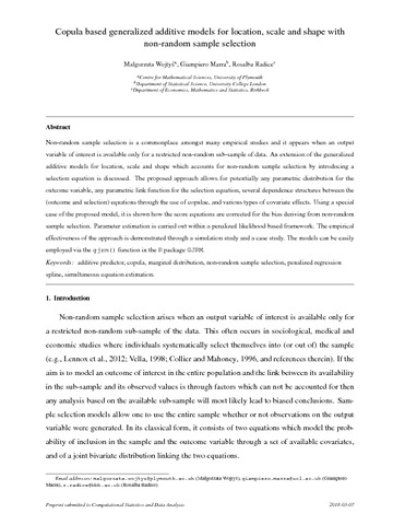 Copula based generalized additive models for location, scale and shape with non-random sample selection.