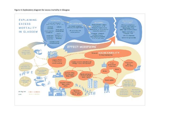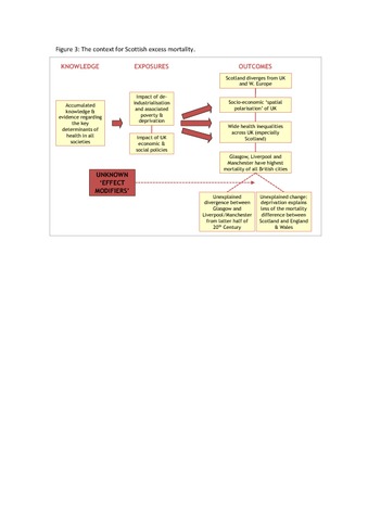 OBJECTIVES: High levels of excess mortality (i.e. that not explained by deprivation) have been observed for Scotland compared with England & Wales, and especially for Glasgow in comparison with similar post-industrial cities such as Liverpool and Manchester. Many potential explanations have been suggested. Based on an assessment of these, the aim was to develop an understanding of the most likely underlying causes. Note that this paper distils a larger research report, with the aim of reaching wider audiences beyond Scotland, as the important lessons learnt are relevant to other populations. STUDY DESIGN: Review and dialectical synthesis of evidence. METHODS: Forty hypotheses were examined, including those identified from a systematic review. The relevance of each was assessed by means of Bradford Hill's criteria for causality alongside—for hypotheses deemed causally linked to mortality—comparisons of exposures between Glasgow and Liverpool/Manchester, and between Scotland and the rest of Great Britain. Where gaps in the evidence base were identified, new research was undertaken. Causal chains of relevant hypotheses were created, each tested in terms of its ability to explain the many different aspects of excess mortality. The models were further tested with key informants from public health and other disciplines. RESULTS: In Glasgow's case, the city was made more vulnerable to important socioeconomic (deprivation, deindustrialisation) and political (detrimental economic and social policies) exposures, resulting in worse outcomes. This vulnerability was generated by a series of historical factors, processes and decisions: the lagged effects of historical overcrowding; post-war regional policy including the socially selective relocation of population to outside the city; more detrimental processes of urban change which impacted on living conditions; and differences in local government responses to UK government policy in the 1980s which both impacted in negative terms in Glasgow and also conferred protective effects on comparator cities. Further resulting protective factors were identified (e.g. greater ‘social capital’ in Liverpool) which placed Glasgow at a further relative disadvantage. Other contributory factors were highlighted, including the inadequate measurement of deprivation. A similar ‘explanatory model’ resulted for Scotland as a whole. This included: the components of the Glasgow model, given their impact on nationally measured outcomes; inadequate measurement of deprivation; the lagged effects of deprivation (in particular higher levels of overcrowding historically); and additional key vulnerabilities. CONCLUSIONS: The work has helped to further understanding of the underlying causes of Glasgow's and Scotland's high levels of excess mortality. The implications for policy include the need to address three issues simultaneously: to protect against key exposures (e.g. poverty) which impact detrimentally across all parts of the UK; to address the existing consequences of Glasgow's and Scotland's vulnerability; and to mitigate against the effects of future vulnerabilities which are likely to emerge from policy responses to contemporary problems which fail sufficiently to consider and to prevent long-term, unintended social consequences.