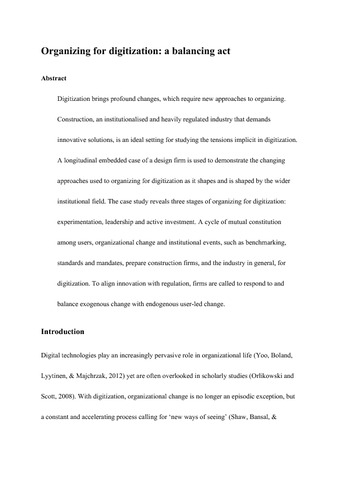 Digitization brings profound changes, which require new approaches to organizing. Construction, an institutionalised and heavily regulated industry that demands innovative solutions, is an ideal setting for studying the tensions implicit in digitization. A longitudinal embedded case of a design firm is used to demonstrate the changing approaches used to organizing for digitization as it shapes and is shaped by the wider institutional field. The case study reveals three stages of organizing for digitization: experimentation, leadership and active investment. A cycle of mutual constitution among users, organizational change and institutional events, such as benchmarking, standards and mandates, prepare construction firms, and the industry in general, for digitization. To align innovation with regulation, firms are called to respond to and balance exogenous change with endogenous user-led change.