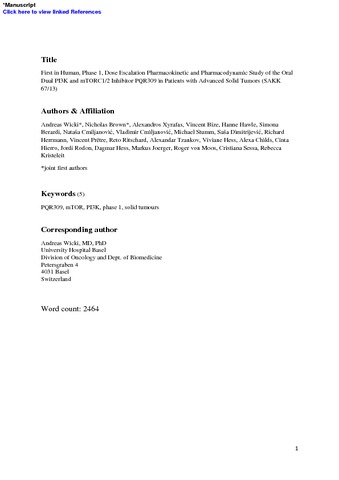 | Title: | First-in human, phase 1, dose-escalation pharmacokinetic and pharmacodynamic study of the oral dual PI3K and mTORC1/2 inhibitor PQR309 in patients with advanced solid tumors (SAKK 67/13) |