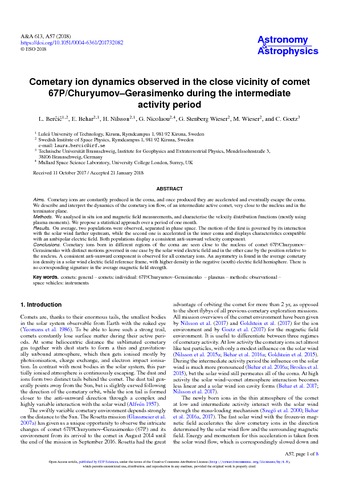 Title: | Cometary ion dynamics observed in the close vicinity of comet 67P/Churyumov–Gerasimenko during the intermediate activity period |