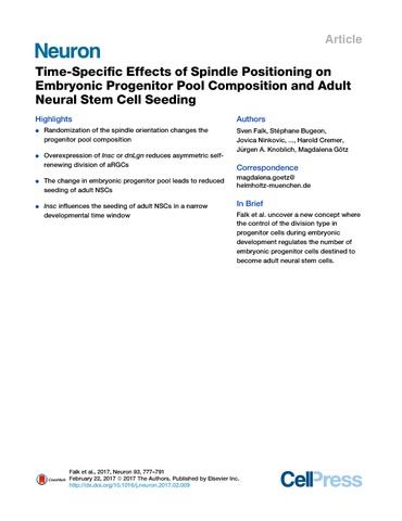 Title: | Time-Specific Effects of Spindle Positioning on Embryonic Progenitor Pool Composition and Adult Neural Stem Cell Seeding |