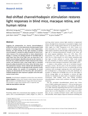 Title: | Red-shifted channelrhodopsin stimulation restores light responses in blind mice, macaque retina, and human retina |