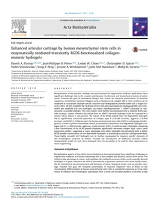 Title: | Enhanced articular cartilage by human mesenchymal stem cells in enzymatically mediated transiently RGDS-functionalized collagen-mimetic hydrogels |
