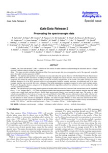 Context: The Gaia Data Release 2 (DR2) contains the first release of radial velocities complementing the kinematic data of a sample of about 7 million relatively bright, late-type stars. // Aims: This paper provides a detailed description of the Gaia spectroscopic data processing pipeline, and of the approach adopted to derive the radial velocities presented in DR2. // Methods: The pipeline must perform four main tasks: (i) clean and reduce the spectra observed with the Radial Velocity Spectrometer (RVS); (ii) calibrate the RVS instrument, including wavelength, straylight, line-spread function, bias non-uniformity, and photometric zeropoint; (iii) extract the radial velocities; and (iv) verify the accuracy and precision of the results. The radial velocity of a star is obtained through a fit of the RVS spectrum relative to an appropriate synthetic template spectrum. An additional task of the spectroscopic pipeline was to provide first-order estimates of the stellar atmospheric parameters required to select such template spectra. We describe the pipeline features and present the detailed calibration algorithms and software solutions we used to produce the radial velocities published in DR2. // Results: The spectroscopic processing pipeline produced median radial velocities for Gaia stars with narrow-band near-IR magnitude GRVS ≤ 12 (i.e. brighter than V ~ 13). Stars identified as double-lined spectroscopic binaries were removed from the pipeline, while variable stars, single-lined, and non-detected double-lined spectroscopic binaries were treated as single stars. The scatter in radial velocity among different observations of a same star, also published in Gaia DR2, provides information about radial velocity variability. For the hottest (Teff ≥ 7000 K) and coolest (Teff ≤ 3500 K) stars, the accuracy and precision of the stellar parameter estimates are not sufficient to allow selection of appropriate templates. The radial velocities obtained for these stars were removed from DR2. The pipeline also provides a first-order estimate of the performance obtained. The overall accuracy of radial velocity measurements is around ~200–300 m s−1, and the overall precision is ~1 km s−1; it reaches ~200 m s−1 for the brightest stars.