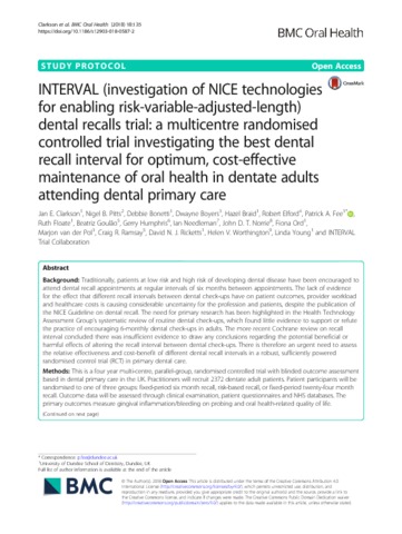 Title: | INTERVAL (investigation of NICE technologies for enabling risk-variable-adjusted-length) dental recalls trial: a multicentre randomised controlled trial investigating the best dental recall interval for optimum, cost-effective maintenance of oral health in dentate adults attending dental primary care |