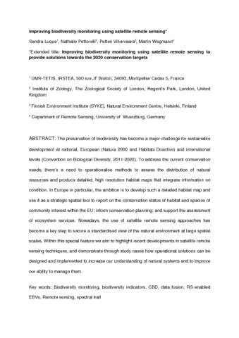 Title: | Improving biodiversity monitoring using satellite remote sensing to provide solutions towards the 2020 conservation targets |