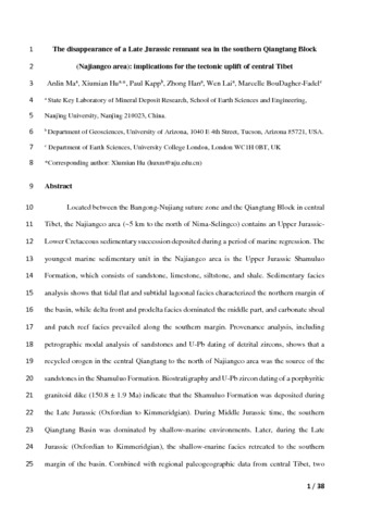 | Title: | The disappearance of a Late Jurassic remnant sea in the southern Qiangtang Block (Shamuluo Formation, Najiangco area): Implications for the tectonic uplift of central Tibet |