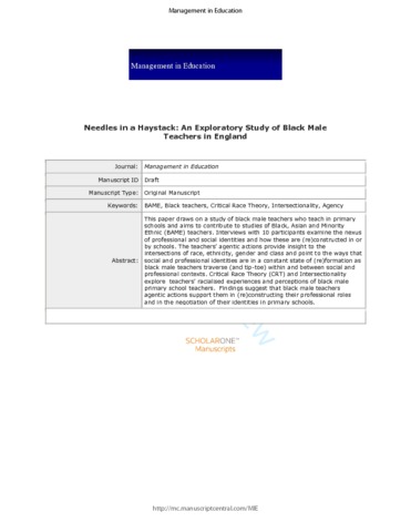 Title: | Needles in a Haystack: An Exploratory Study of Black Male Teachers in England |
