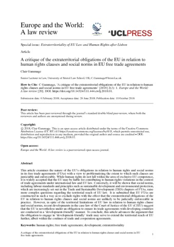 Title: | A critique of the extraterritorial obligations of the EU in relation to human rights clauses and social norms in EU free trade agreements |
