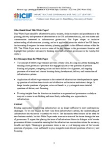 Existing approaches to delivering infrastructure are no longer sufficient to meet contemporary challenges. To be able to gain the best value from infrastructure systems, the understanding of infrastructure delivery needs to continue to evolve. The discussion often focuses on the need for new business models, but this White Paper seeks to examine some of the issues through the lens of governance. It argues that placing the issue of infrastructure futures in dialogue with broader governance debates can assist in ensuring that the infrastructure conversation retains the necessary breadth and depth. Thinking in governance terms is one way of keeping some of the broader questions of purpose, value and benefit in play alongside more detailed questions of delivery and financing. The principal aim of this White Paper is to review some key themes in the recent governance literature and highlight their potential relevance to thinking about infrastructure governance in the twenty-first century. It notes, in particular, that reflexive governance offers a broad and inclusive framework to which learning processes are central. It also argues that the transition management debate can provide insights regarding effective approaches for moving towards embedding new infrastructure understandings.