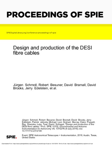 The Dark Energy Spectroscopic Instrument (DESI) is under construction to measure the expansion history of the Universe using the Baryonic Acoustic Oscillation technique. The spectra of 35 million galaxies and quasars over 14000 sq deg will be measured during the life of the experiment. A new prime focus corrector for the KPNO Mayall telescope will deliver light to 5000 fibre optic positioners. The fibres in turn feed 10 broad-band spectrographs. We will describe the design and production progress on the fibre cables, strain relief system and preparation of the slit end. In contrast to former projects, the larger scale of production required for DESI requires teaming up with industry to find a solution to reduce the time scale of production as well as to minimise the stress on the optical fibres.