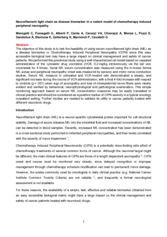 Neurofilament light chain as disease biomarker in a rodent model of chemotherapy induced peripheral neuropathy.