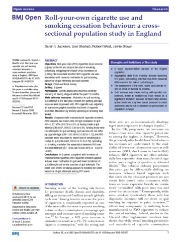 Title: | Roll-your-own cigarette use and smoking cessation behaviour: a cross-sectional population study in England |
