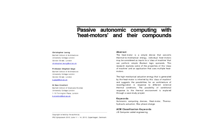 The heat-motor is a simple device that converts thermal-to-mechanical energy, individual heat-motors may be considered as inputs to a ‘class of machine’ that can perform simple Boolean logic operands. This research explores some of the properties of this ‘class of machine’ and an application that uses multiple heatmotors. The high mechanical actuation energy that is generated by the heat-motor is inherted by this ‘class of machine’ and suggests the possibilities for an architecture of reconfiguration in response to different external thermal conditions. The possibility of conditional response to the thermal environment is explored through a case-study project.