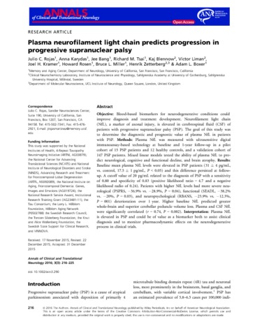 Plasma neurofilament light chain predicts progression in progressive supranuclear palsy.